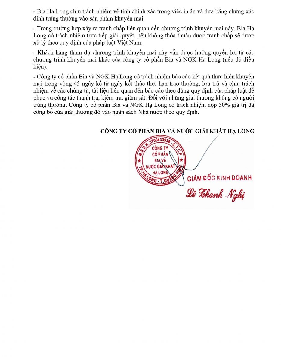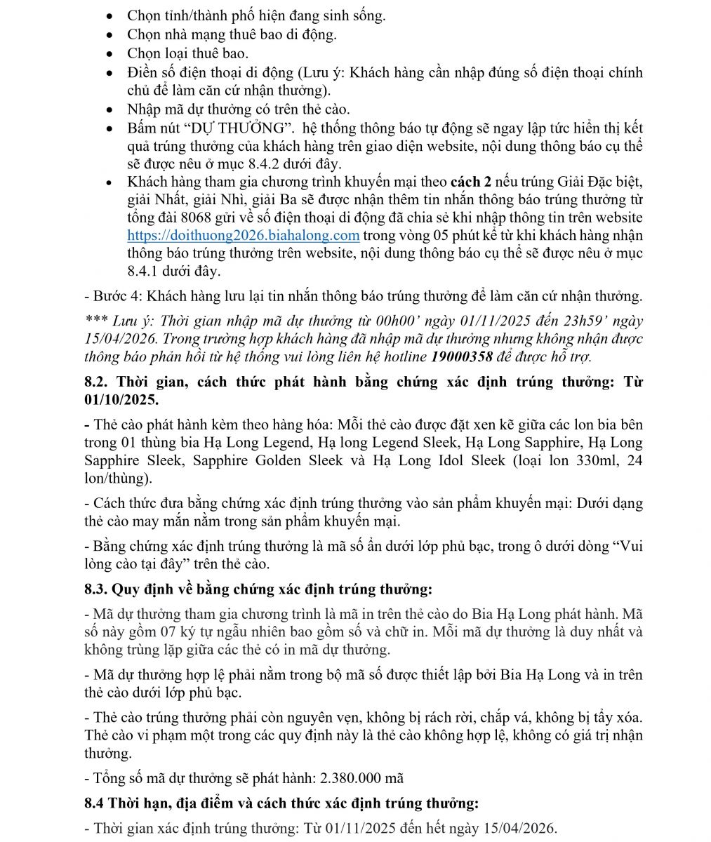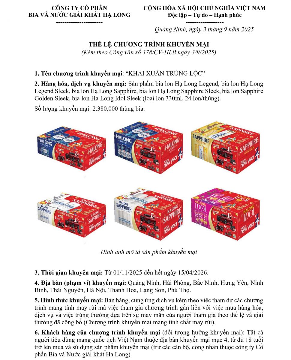 2. Hàng hóa, dịch vụ khuyến mại: Sản phẩm bia lon Hạ Long Legend, bia lon Hạ Long Legend Sleek, bia lon Hạ Long Sapphire, bia lon Hạ Long Sapphire Sleek, bia lon Sapphire Golden Sleek, bia lon Hạ Long Idol Sleek (loại lon 330ml, 24 lon/thùng).